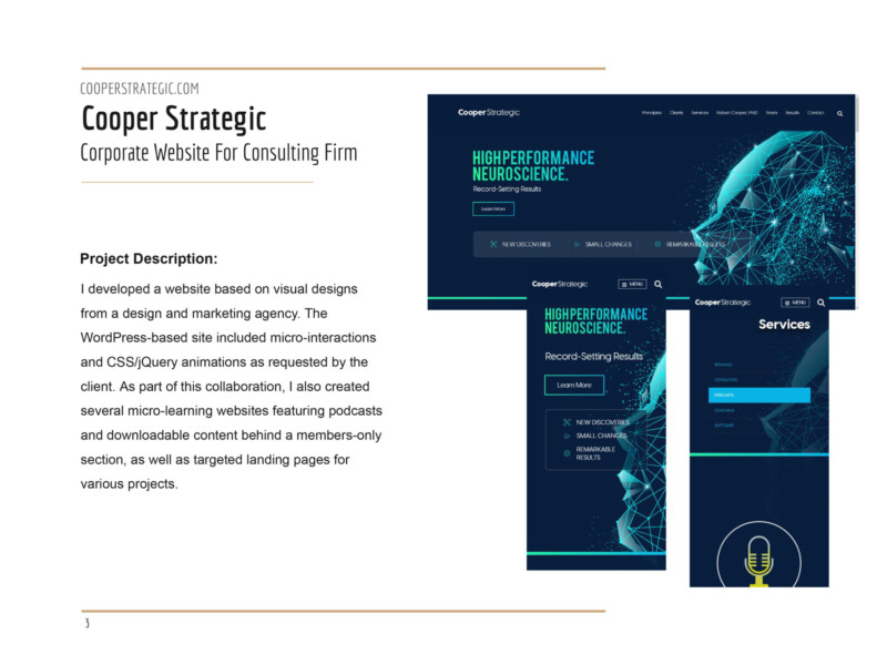- Signature SaaS Development: Partnered with Cooper Strategic to create online learning communities with advanced user interaction features.